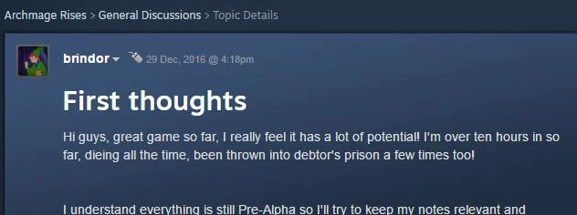 Brindor wrote a very detailed feedback on Steam last week and while we did respond to it in detail on steam, we thought we'd talk about his wish list items in the update.