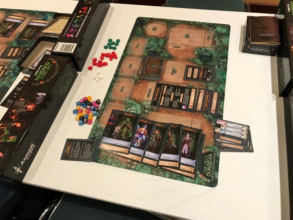 I then played One Deck Dungeon, a rogue like dungeon crawler that can be played single player or coop 2 player. It uses interesting dice pools skills, and chaining combos to defeat enemies. Once you win an encounter, you decide to take the card as an item (more dice), skill (more cool things), or XP (to level up). We burned through the first level too fast so were underpowered and died on the third level. It's a very interesting game so I picked one up to "research" more for Archmage Rises.